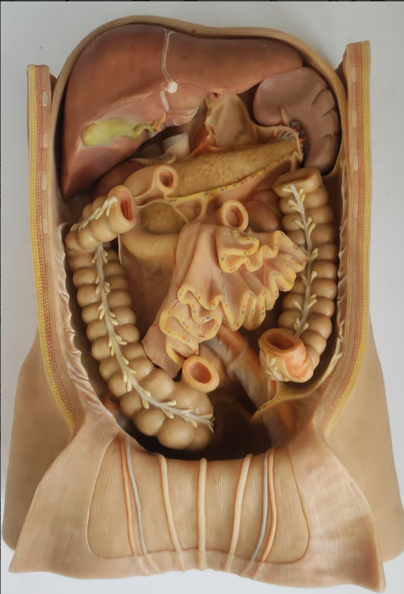 The highly realistic silicone anatomical model of the mesentery and posterior abdominal wall from Meiwo primarily reflects the mesenteric attachment sites of intraperitoneal organs, including the liver, spleen, left and right colons, mesenteric root, duodenum, pancreas, celiac trunk and related blood vessel routes, left and right kidneys, superior mesenteric artery and vein, and inferior mesenteric artery and vein.